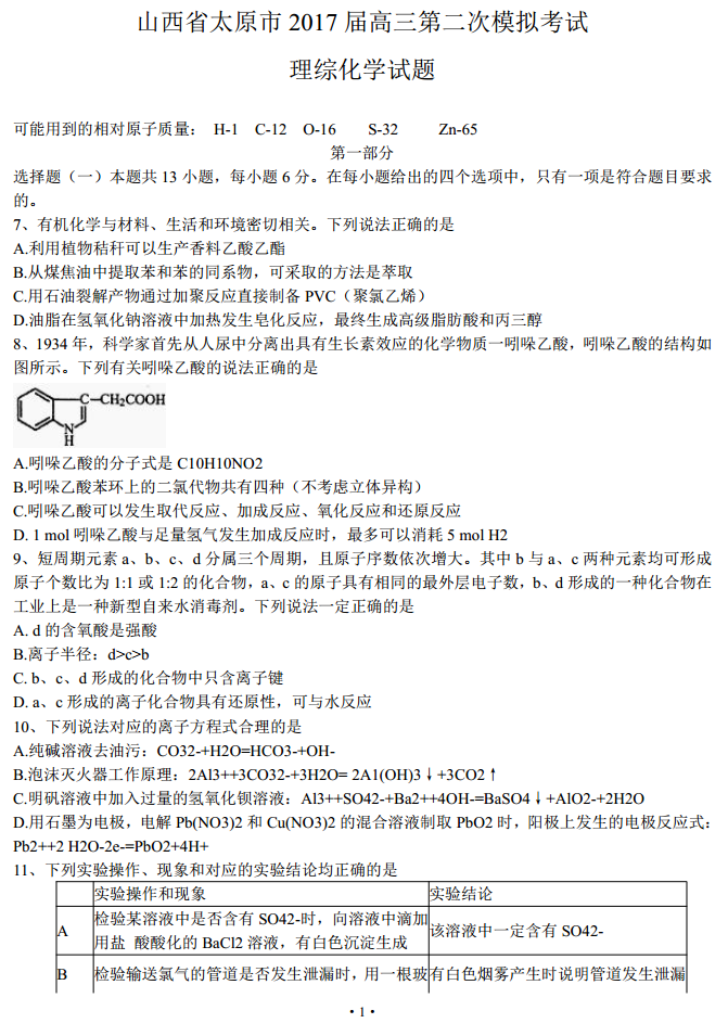 2017太原二模理综试题及答案(5)