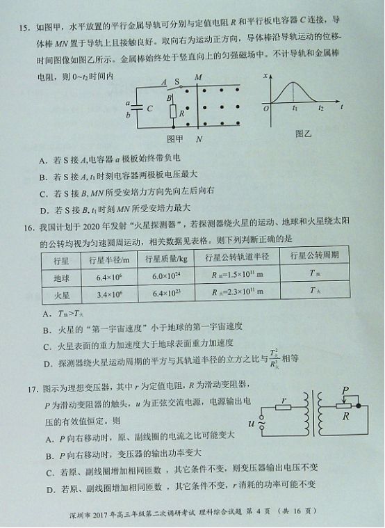 2017年深圳二模理综试题及答案(4)