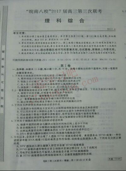 皖南八校2017届高三第三次联考理综试题答案