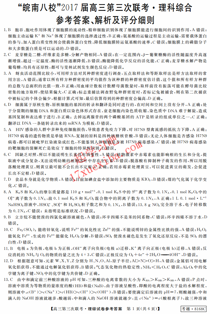 皖南八校2017届高三第三次联考理综试题答案(13)