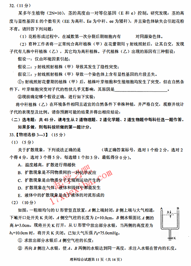 绵阳市高中2014级第三次诊断性考试理科综合试题及答案(11)
