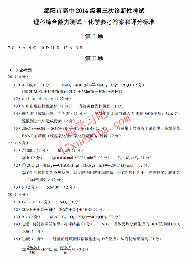 绵阳市高中2014级第三次诊断性考试理科综合试题及答案(15)