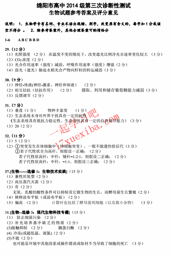 绵阳市高中2014级第三次诊断性考试理科综合试题及答案(17)