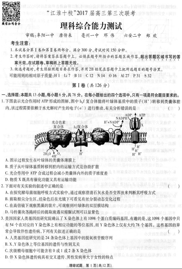 2017江淮十校高三第三次联考理综试题答案