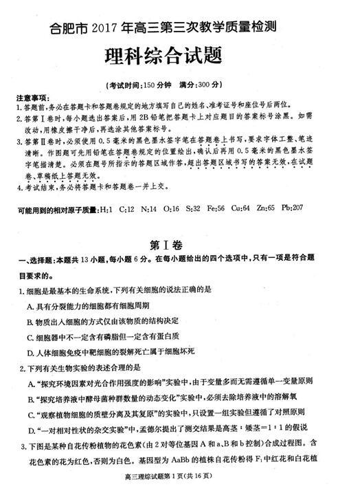 2017年合肥三模理综试题及答案