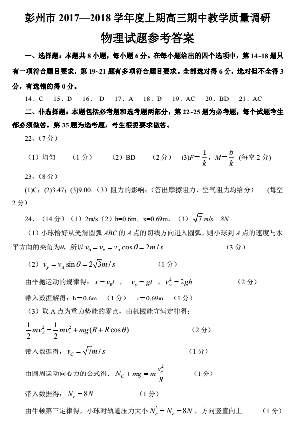 彭州市2017-2018学年上期高三期中教学质量调研理科综合试题答案