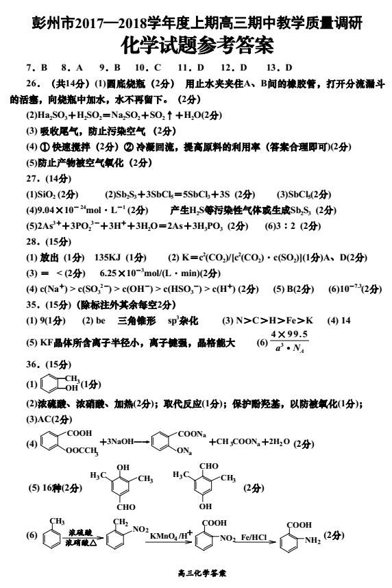 彭州市2017-2018学年上期高三期中教学质量调研理科综合试题答案(4)