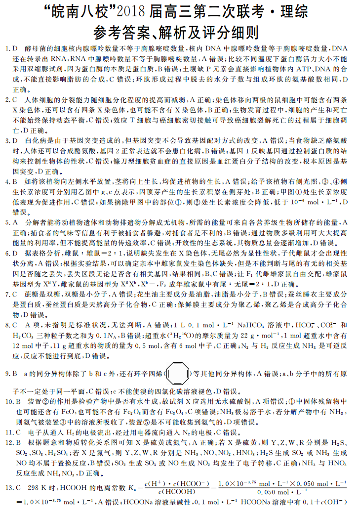 2018届皖南八校高三第二次联考理综试题答案
