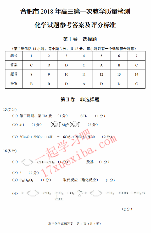2018年合肥一模理综试题及答案