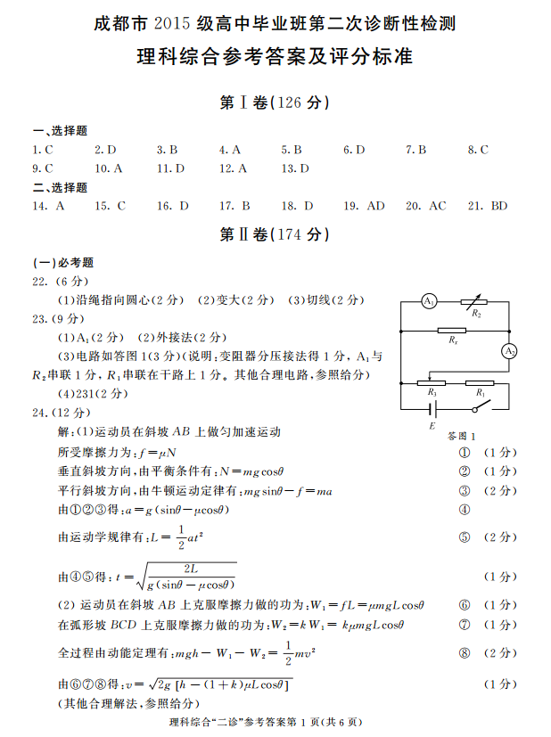 2018年成都二诊理综试题及答案
