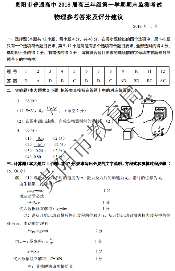贵阳市2018届高三第一学期期末考理综试题答案(5)
