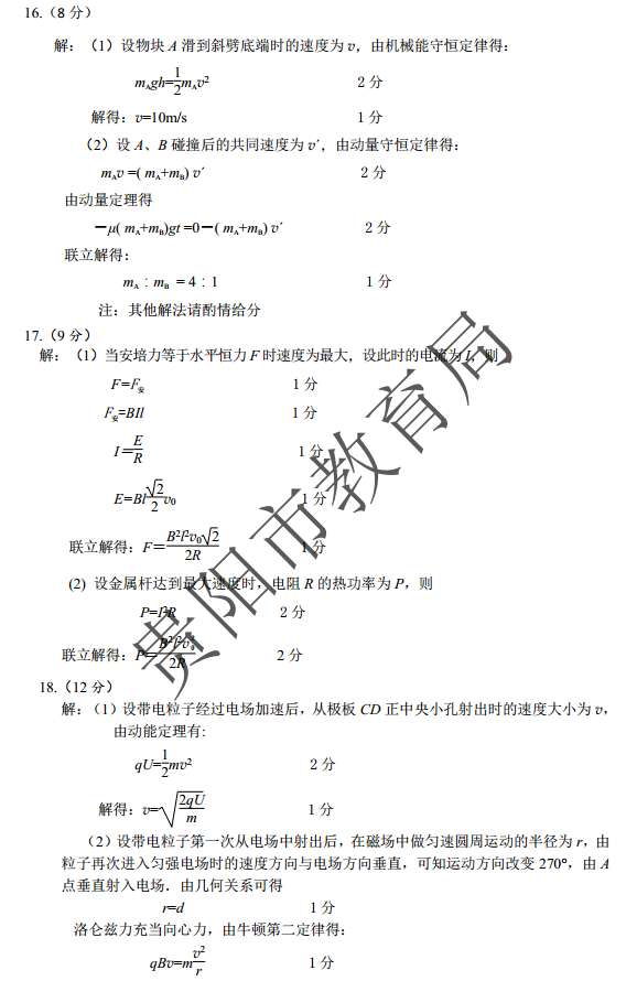 贵阳市2018届高三第一学期期末考理综试题答案(6)
