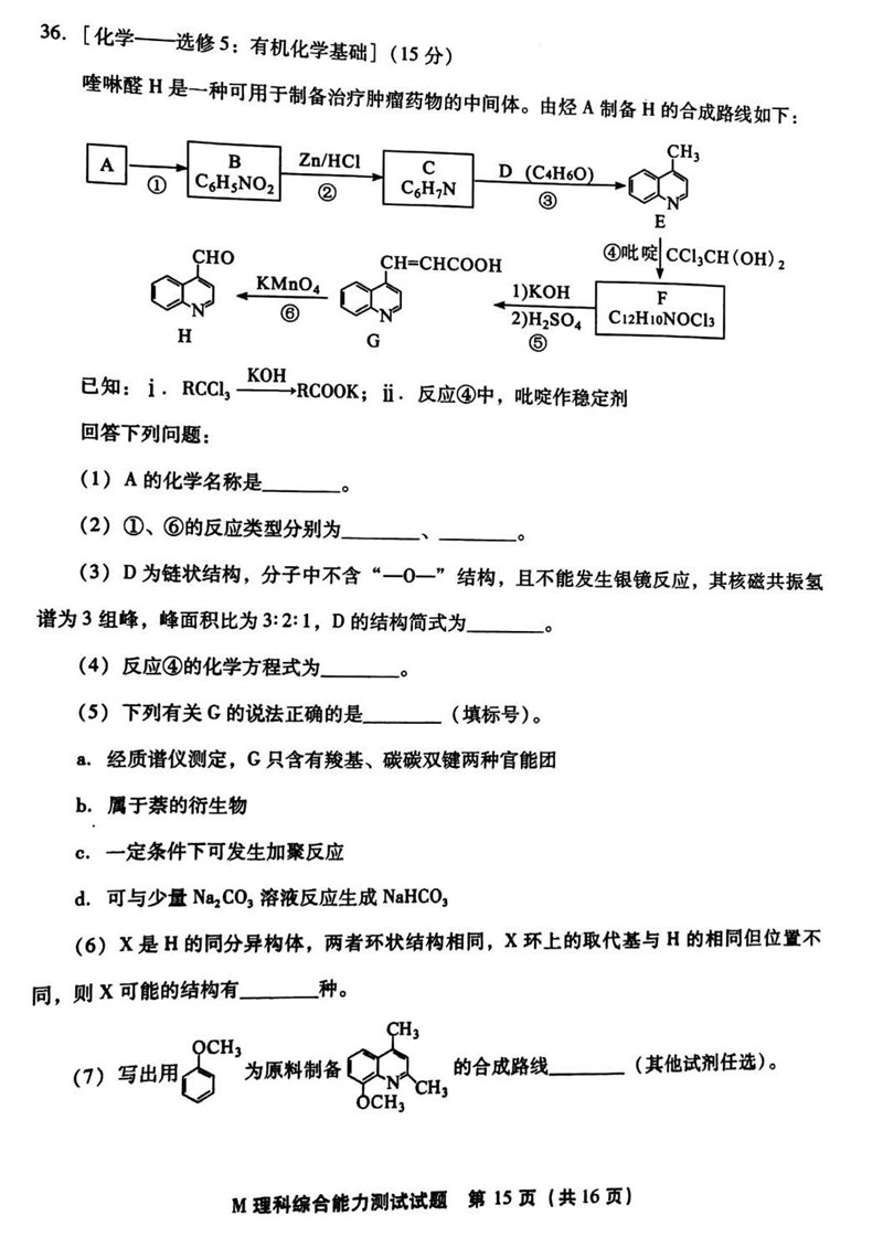 2018年福建省高三质量检查理综试题答案(15)