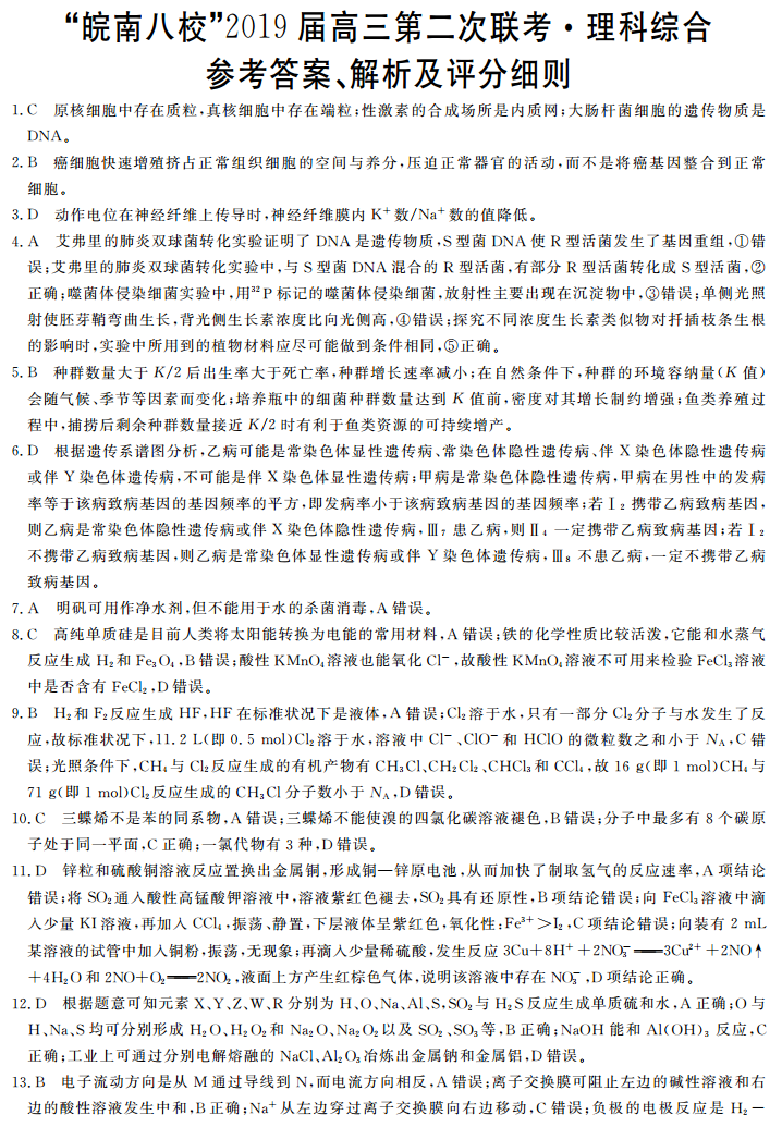 皖南八校2019届高三第二次联考理综试题答案