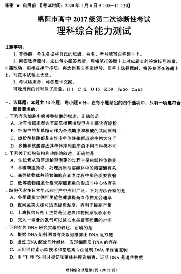 绵阳二诊理综试题及答案