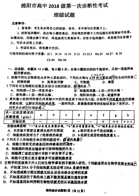2021年绵阳二诊理综试题及答案