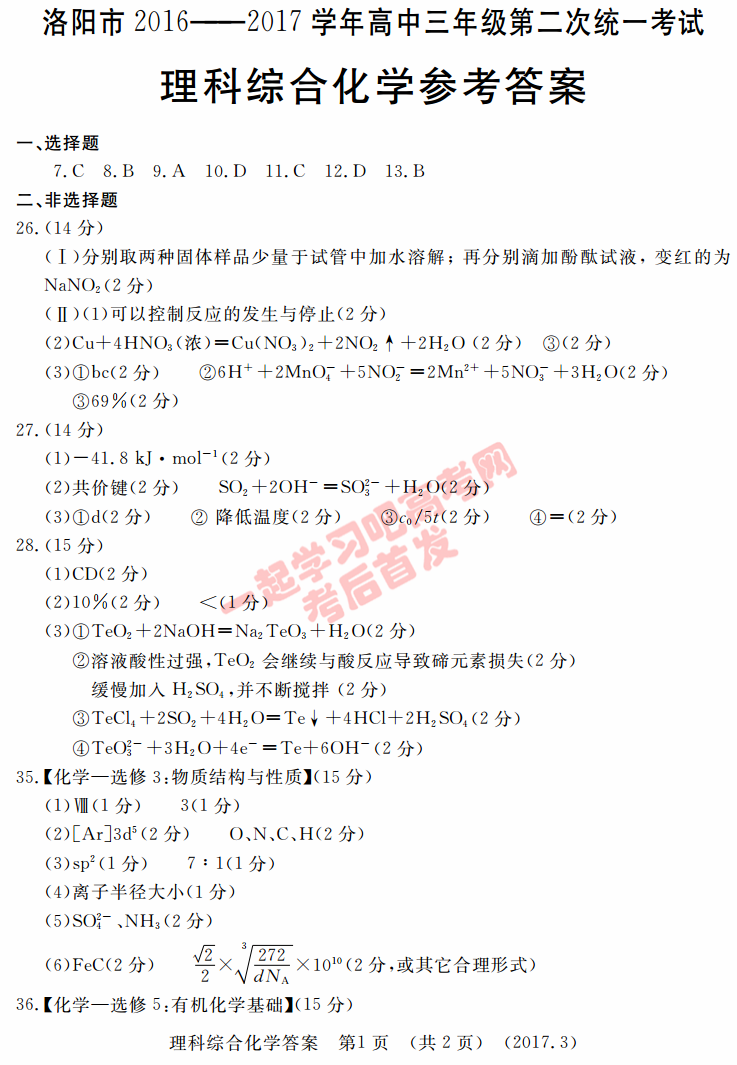 2017年洛阳二练理综答案 2017洛阳二练理科综合试题及答案(5)
