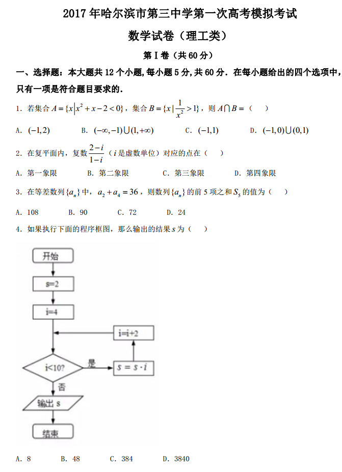 2017年哈三中一模数学理科试题及答案