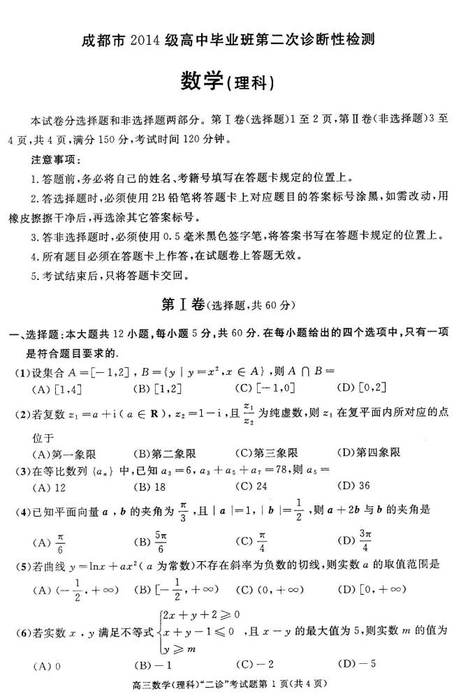 成都市2014级高中毕业班第二次诊断性监测理科数学试题及答案