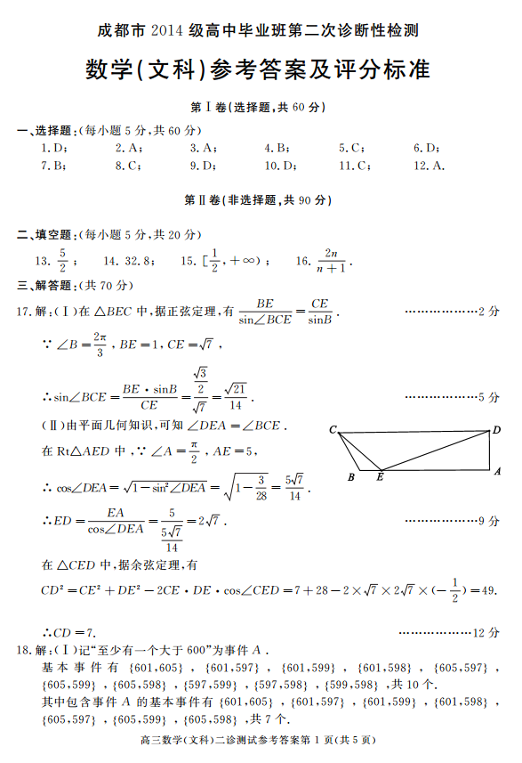成都市2014级高中毕业班第二次诊断性检测文科数学试题及答案(5)