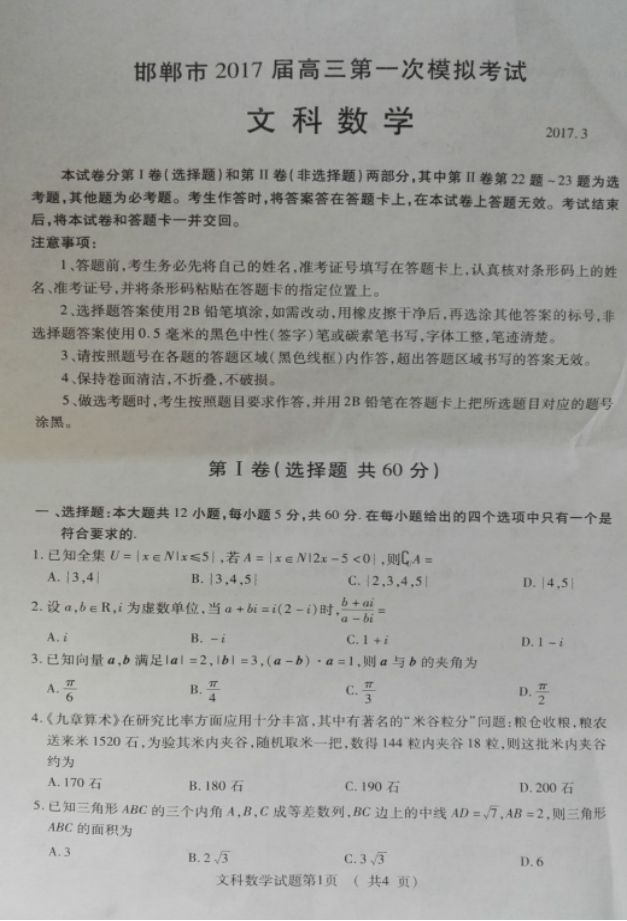 邯郸2017届高三第一次模拟考数学文科试题及答案