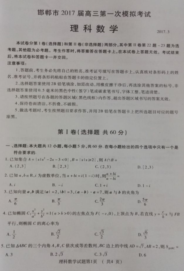 邯郸2017届高三第一次模拟考数学理科试题及答案