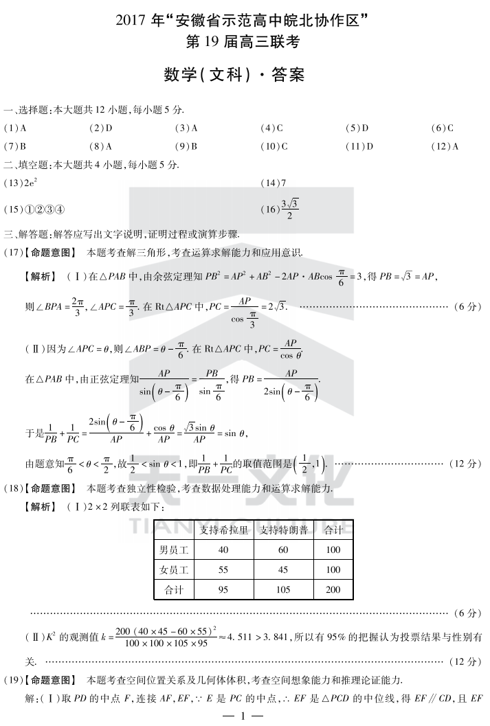 2017皖北协作区联考数学 安徽皖北第19届高三联考文科数学答案