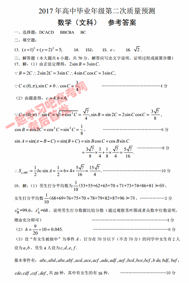 2017郑州二模数学文科答案