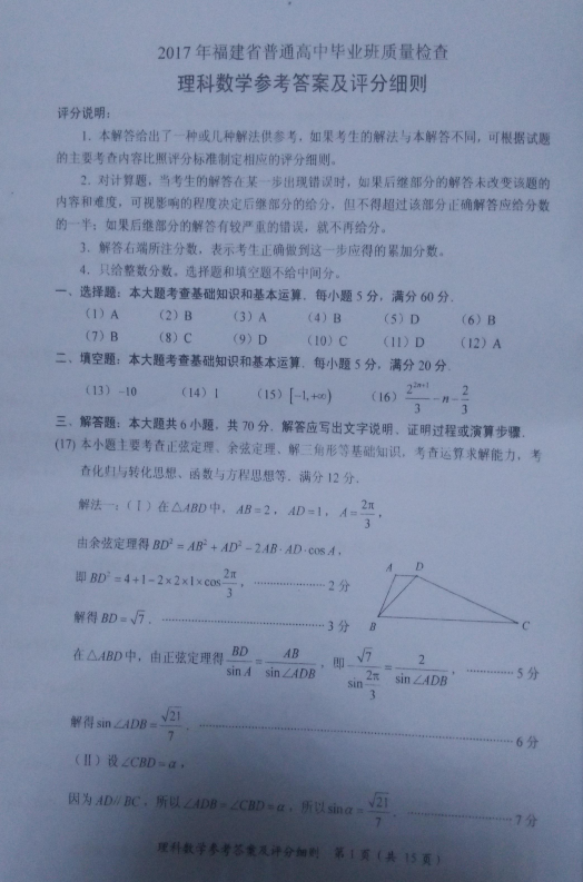 2017年4月福建省高三质量检查数学理科试题答案(5)