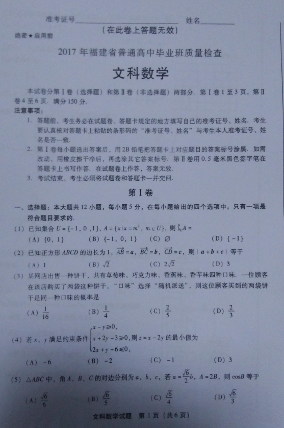 2017年4月福建省高三质量检查数学文科试题答案