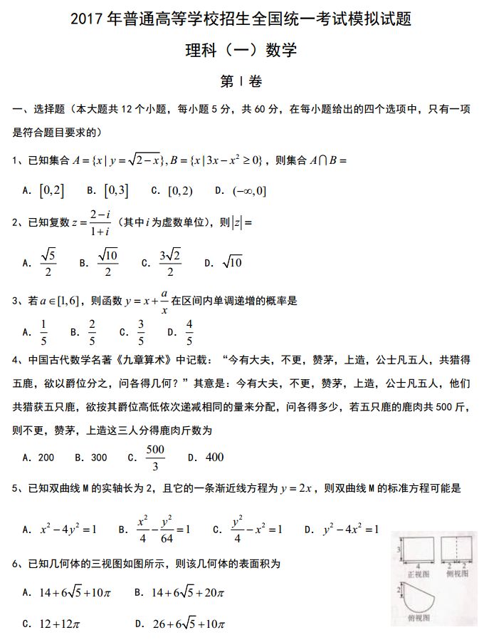 2017河北普通高等学校招生全国统一模拟衡水金卷一数学理科