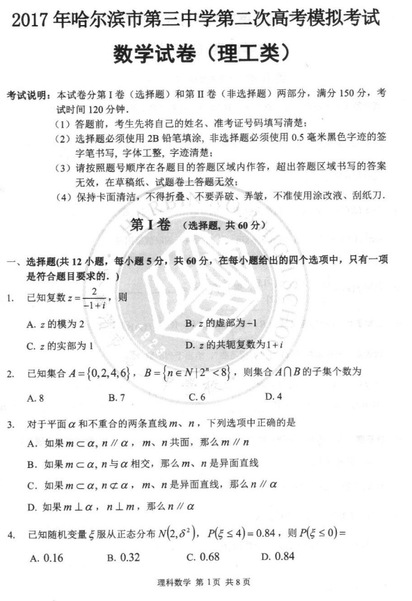2017年哈三中二模数学理科试题及答案
