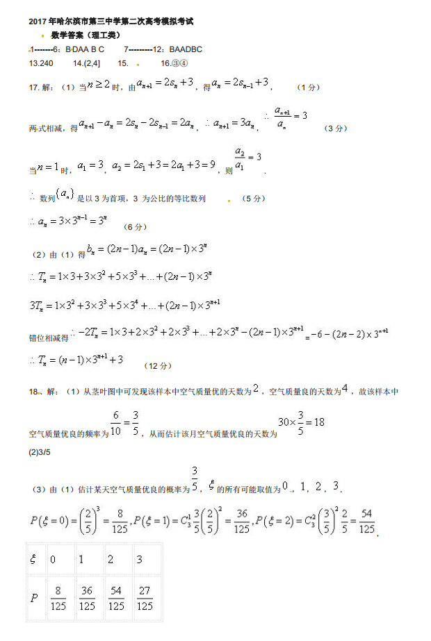 2017年哈三中二模数学理科试题及答案(9)