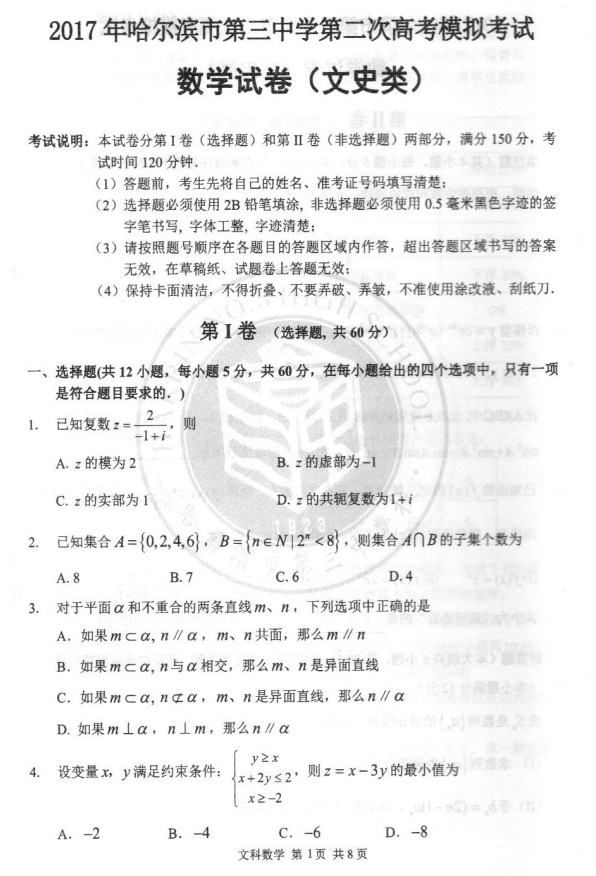 2017年哈三中二模数学文科试题及答案