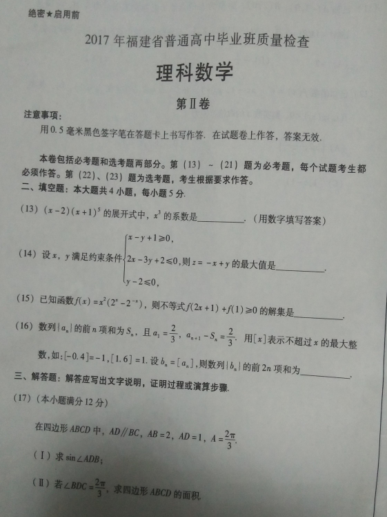 2017年福建普通高中毕业班质量检查理科数学试题及答案(4)