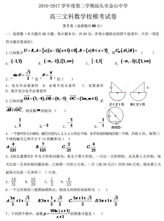广东汕头金山中学2017届高三一模数学文科试题及答案