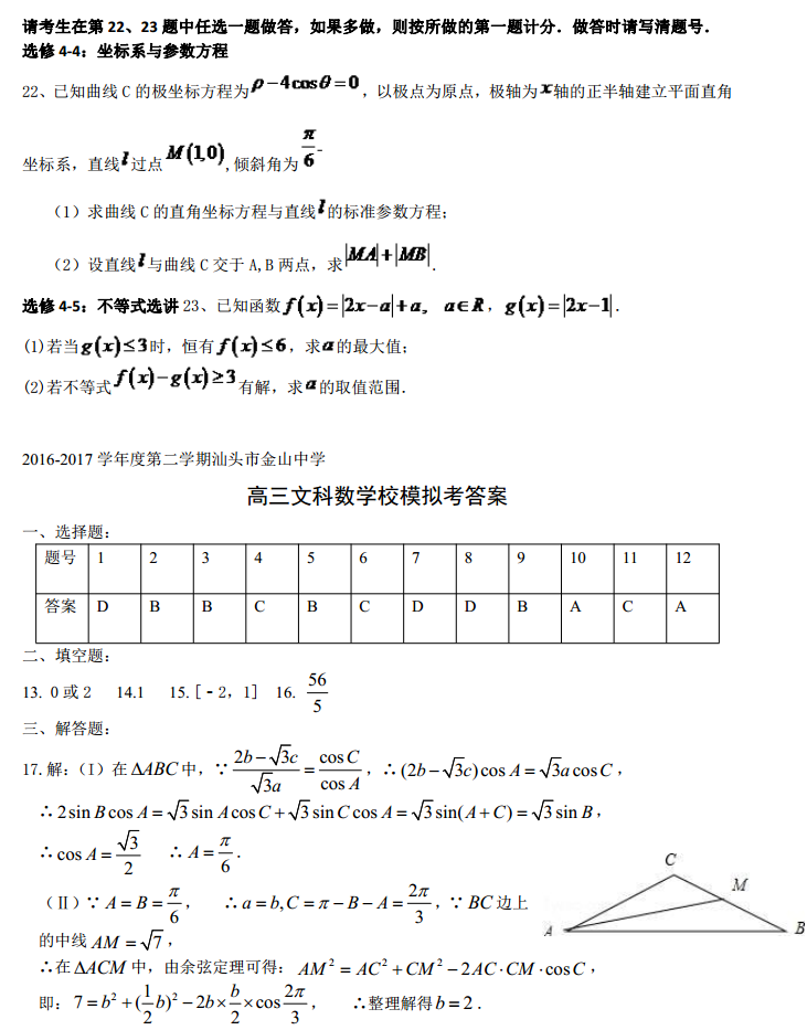 广东汕头金山中学2017届高三一模数学文科试题及答案(5)