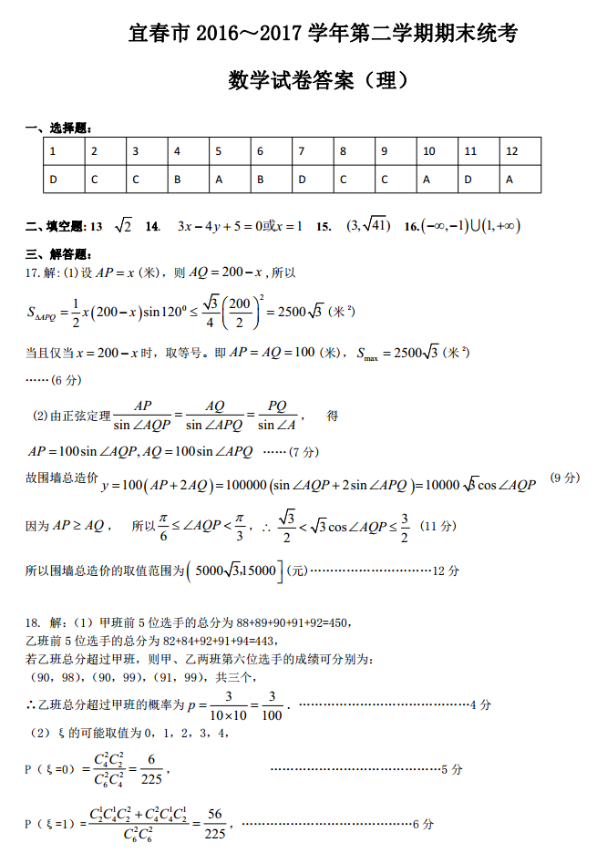 宜春市2017届高三第二学期期末统考数学理科试题答案