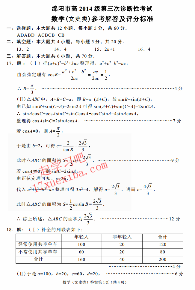 2017绵阳三诊数学文科试题及答案(5)