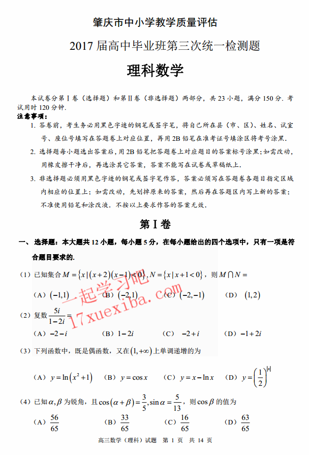肇庆2017届毕业班第三次教学质量检测数学理科试题及答案