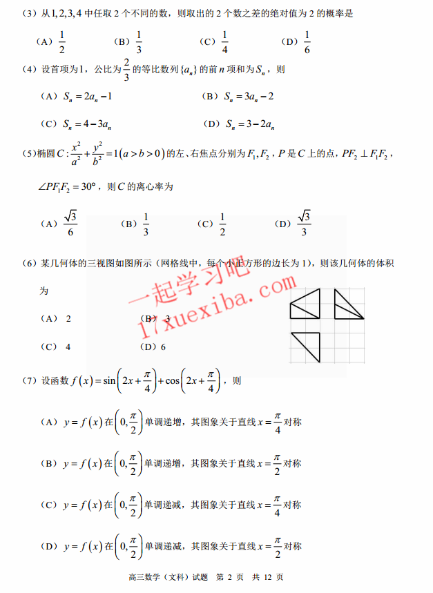 肇庆2017届毕业班第三次教学质量检测数学文科试题及答案(2)