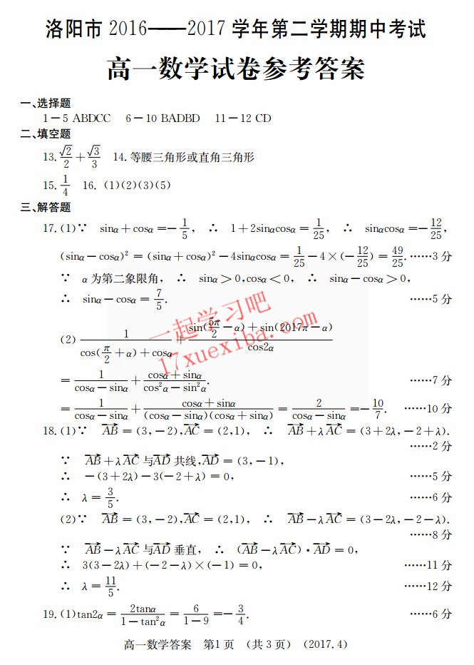 洛阳市2016-2017学年高一期中考数学试题及答案