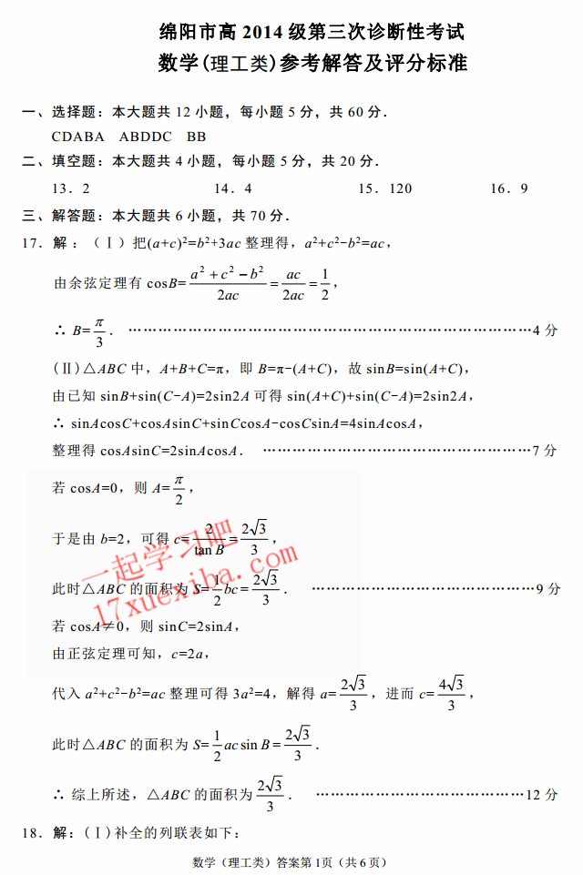绵阳市高中2014级第三次诊断性考试数学理科试题及答案(5)