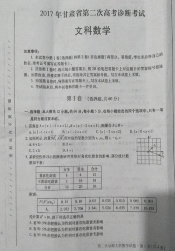 甘肃省2017届高三第二次诊断考试文科数学试题答案