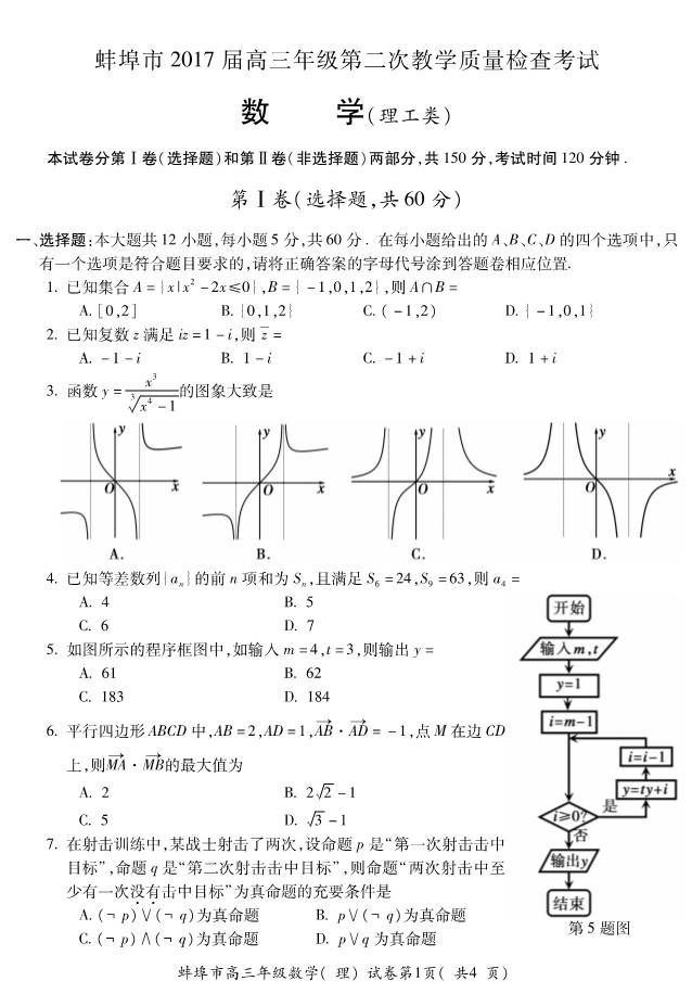 2017蚌埠高三第二次教学质量检查数学理科试题及答案