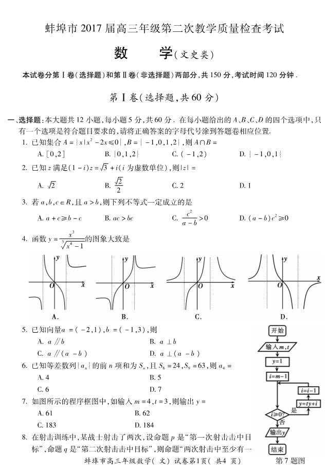 2017蚌埠高三第二次教学质量检查数学文科试题及答案