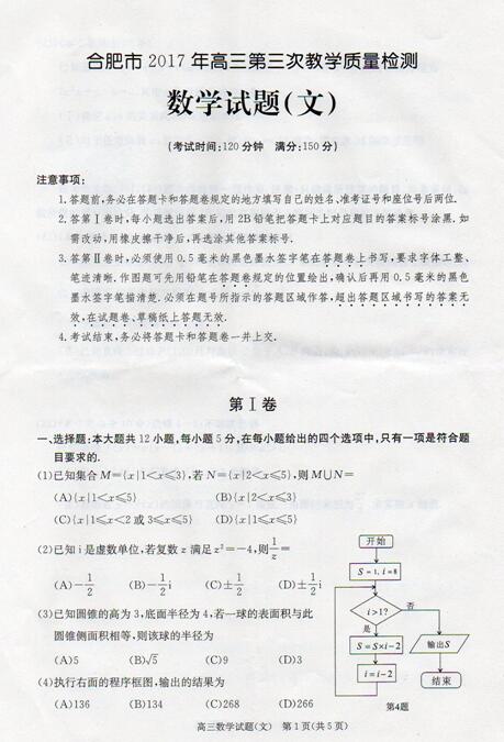 2017合肥市高三第三次教学质量检测数学文科试题答案