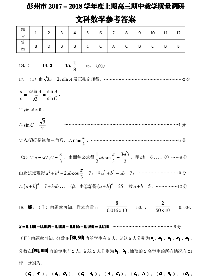 彭州市2017-2018学年上期高三期中教学质量调研文科数学试题答案