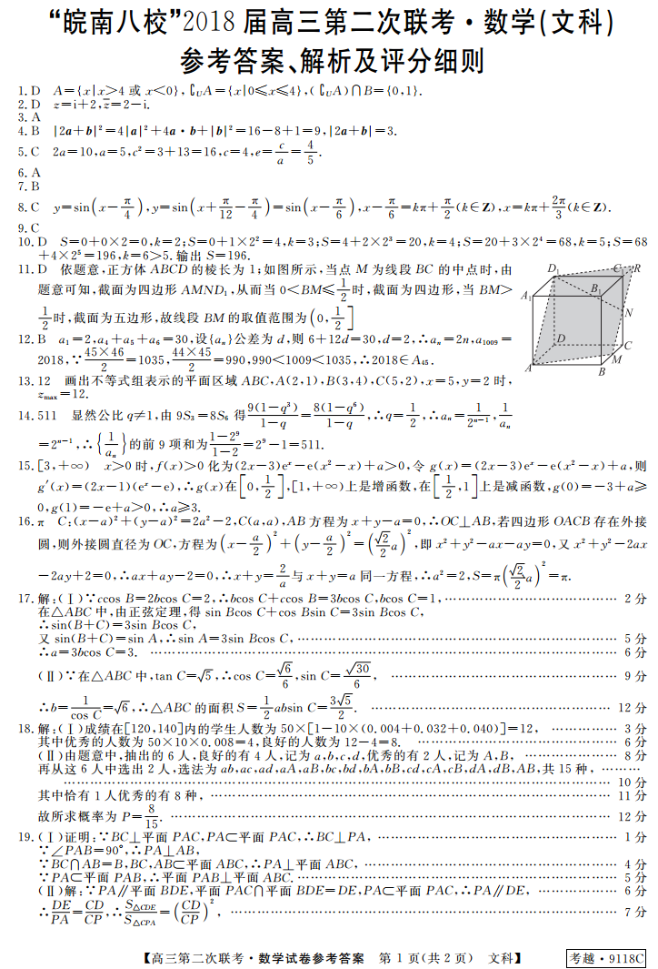 皖南八校2018届高三第二次联考文科数学试题答案