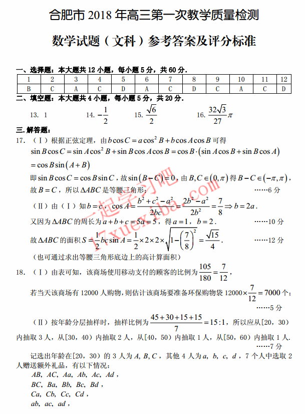 2018年合肥一模文科数学试题及答案